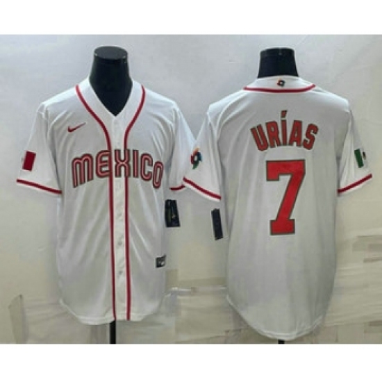 >Men's Mexico Baseball #7 Julio Urias 2023 White World Baseball Classic Stitched Jersey
