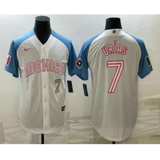 >Men's Mexico Baseball #7 Julio Urias Number 2023 White Blue World Classic Stitched Jersey5