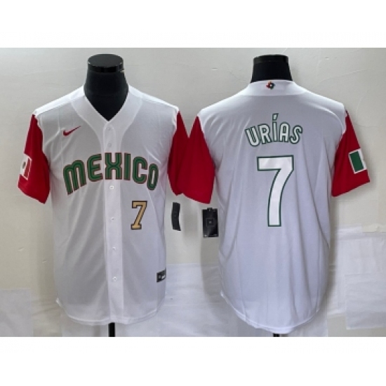 >Men's Mexico Baseball #7 Julio Urias Number 2023 White Red World Classic Stitched Jersey 34