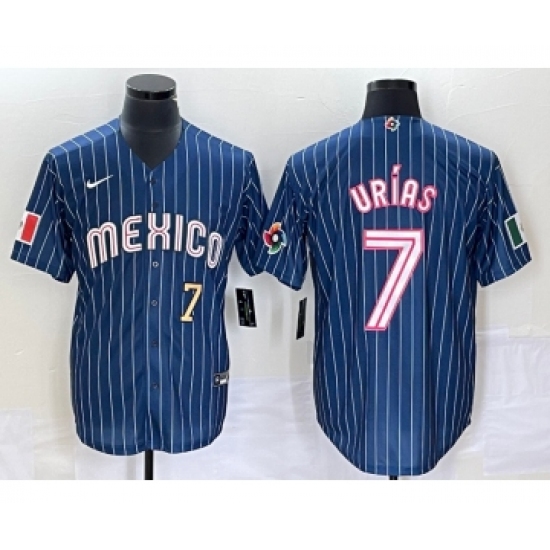 >Men's Mexico Baseball #7 Julio Urias Number Navy Blue Pinstripe 2020 World Series Cool Base Nike Jersey 1