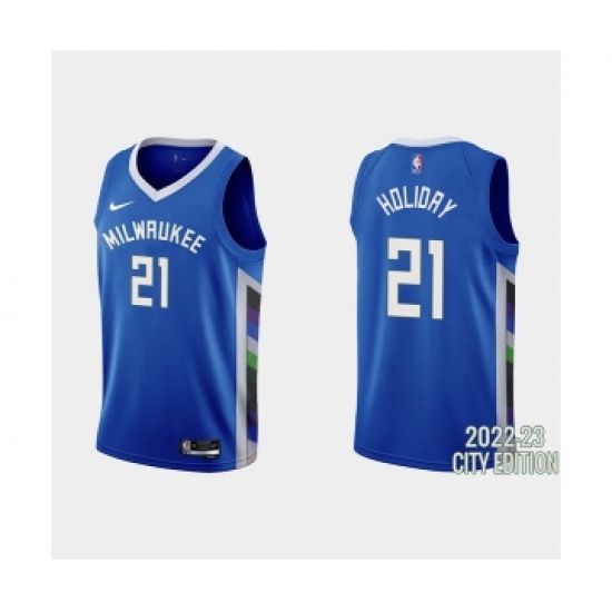 Men's Milwaukee Bucks #21 Jrue Holiday 2022-23 City Edition Blue Stitched Basketball Jersey