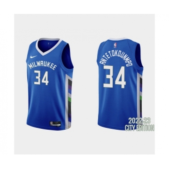 Men's Milwaukee Bucks #34 Giannis Antetokounmpo 2022-23 City Edition Blue Stitched Basketball Jersey