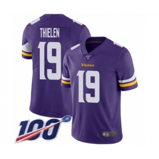 >Men's Minnesota Vikings #19 Adam Thielen Purple Team Color Vapor Untouchable Limited Player 100th Season Football Jersey