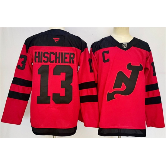 >Men's New Jersey Devils #13 Nico Hischier Red 2024-25 With C Stitched Hockey Jersey