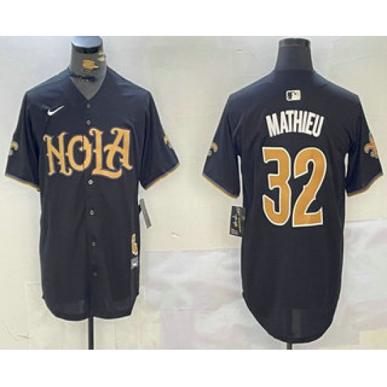 >Men's New Orleans Saints #32 Tyrann Mathieu Black Nola Baseball Jersey