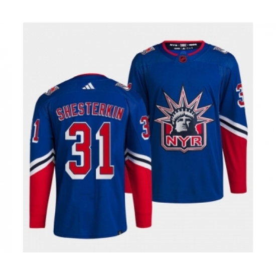 Men's New York Rangers #31 Igor Shesterkin Blue 2022 Reverse Retro Stitched Jersey