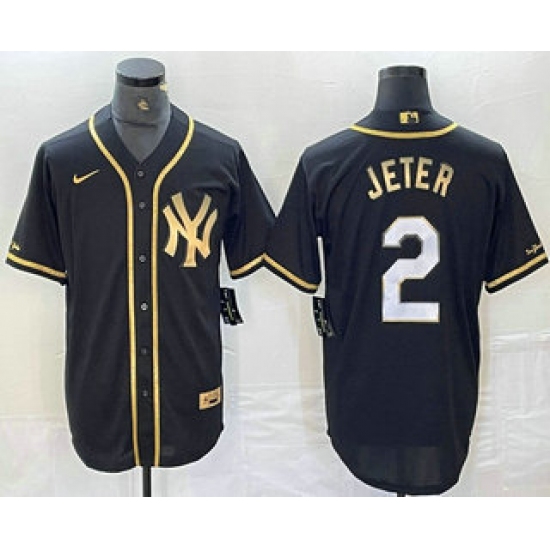 Men's New York Yankees #2 Derek Jeter Black Gold Cool Base Stitched Baseball Jersey