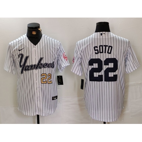 >Men's New York Yankees #22 Juan Soto White Pinstripe Fashion Cool Base Jerseys