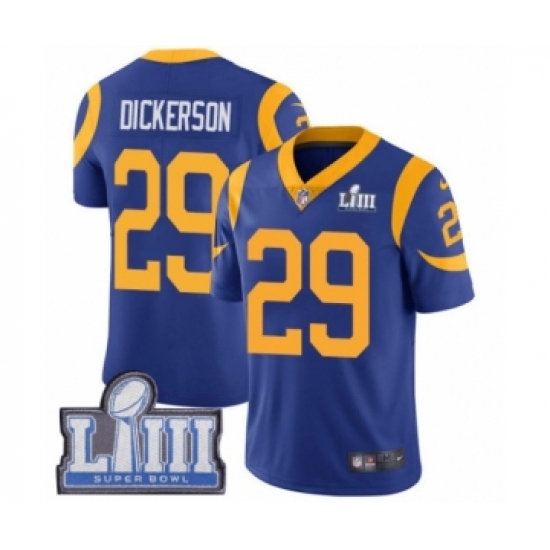 >Men's Nike Los Angeles Rams #29 Eric Dickerson Royal Blue Alternate Vapor Untouchable Limited Player Super Bowl LIII Bound NFL Jersey