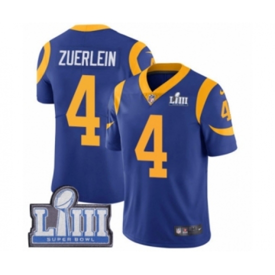 Men's Nike Los Angeles Rams #4 Greg Zuerlein Royal Blue Alternate Vapor Untouchable Limited Player Super Bowl LIII Bound NFL Jersey