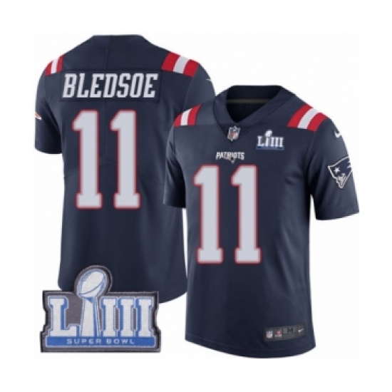 >Men's Nike New England Patriots #11 Drew Bledsoe Limited Navy Blue Rush Vapor Untouchable Super Bowl LIII Bound NFL Jersey