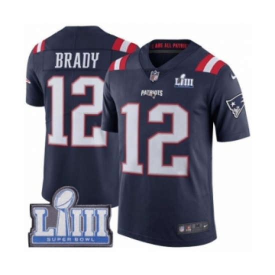 >Men's Nike New England Patriots #12 Tom Brady Limited Navy Blue Rush Vapor Untouchable Super Bowl LIII Bound NFL Jersey