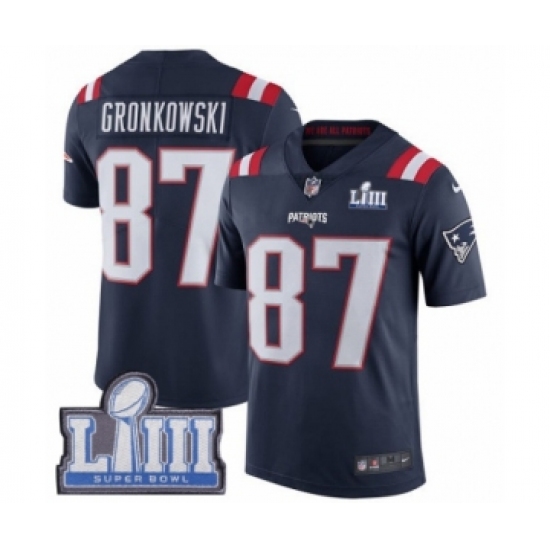 Men's Nike New England Patriots #87 Rob Gronkowski Limited Navy Blue Rush Vapor Untouchable Super Bowl LIII Bound NFL Jersey
