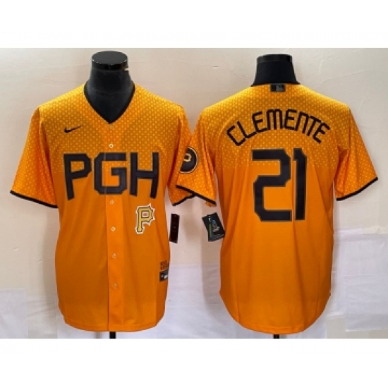 >Men's Nike Pittsburgh Pirates #21 Roberto Clemente Gold 2023 City Connect Stitched Jersey 1