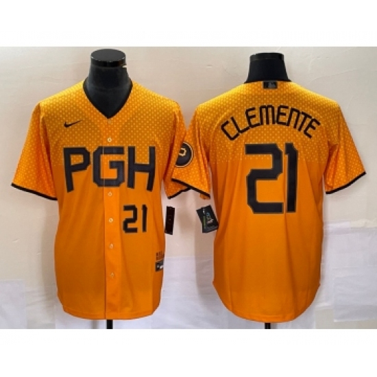 >Men's Nike Pittsburgh Pirates #21 Roberto Clemente Number Gold 2023 City Connect Stitched Jersey1