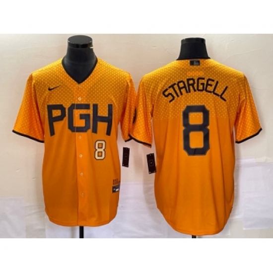 >Men's Nike Pittsburgh Pirates #8 Willie Stargell Number Gold 2023 City Connect Stitched Jersey 2