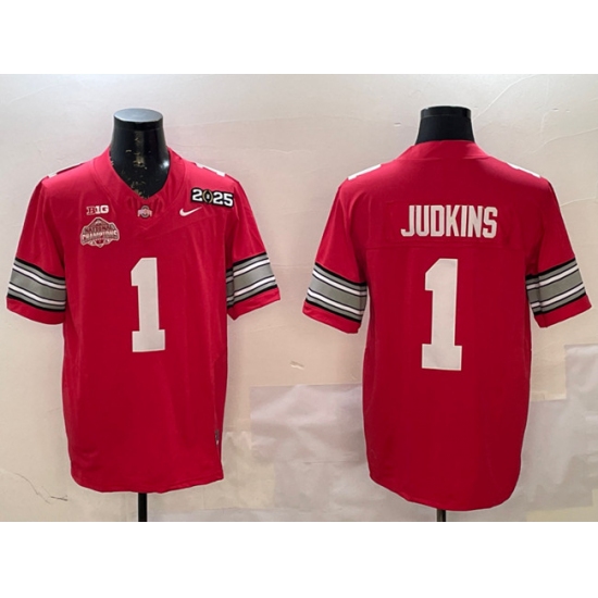 >Men's Ohio State Buckeyes #1 Quinshon Judkins Red 2025 CFP Final With National Champions F.U.S.E. Vapor Limited Stitched Football Jersey