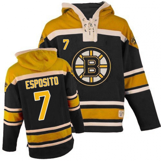 Home>NHL>Boston Bruins>Phil Esposito>Men's Old Time Hockey Boston Bruins #7 Phil Esposito Authentic Black Sawyer Hooded Sweatshirt NHL Jersey