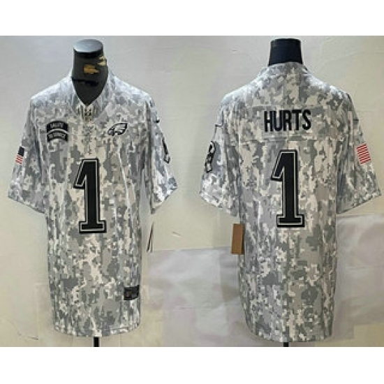 >Men's Philadelphia Eagles #1 Jalen Hurts 2024 FUSE Arctic Camo Salute to Service Limited Stitched Jersey