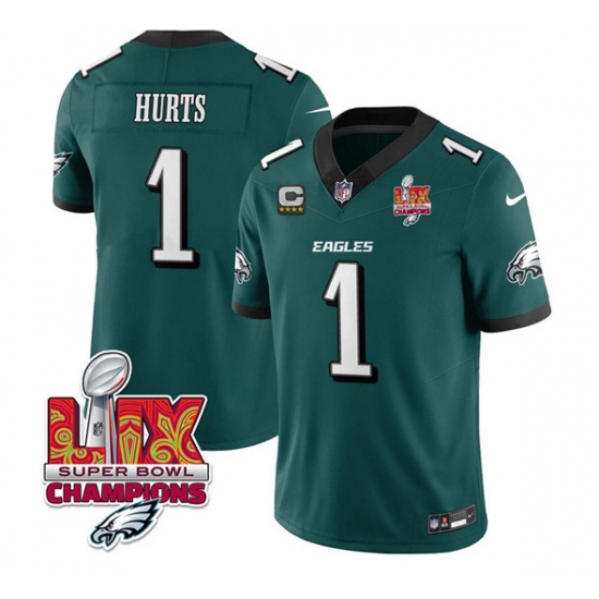 >Men's Philadelphia Eagles #1 Jalen Hurts Green 2025 Eagles Logo Super Bowl LIX With 4-Star C New F.U.S.E. Vapor Untouchable Limited Football Stitched Jerse