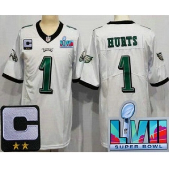 >Men's Philadelphia Eagles #1 Jalen Hurts Limited White C Patch Super Bowl LVII Vapor Jersey