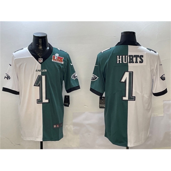 >Men's Philadelphia Eagles #1 Jalen Hurts White & Green Split 2025 Super Bowl LIX Vapor Untouchable Limited Football Stitched Jersey