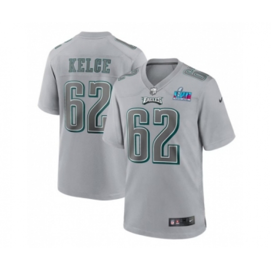 >Men's Philadelphia Eagles #62 Jason Kelce Gray Super Bowl LVII Patch Atmosphere Fashion Stitched Game Jersey