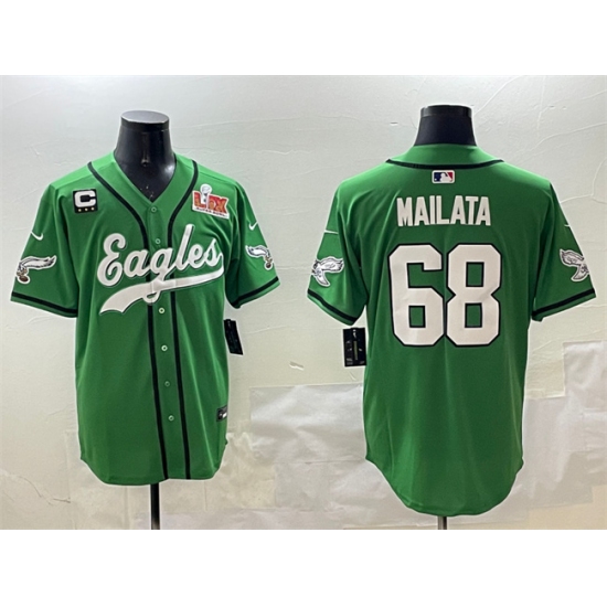 Men's Philadelphia Eagles #68 Jordan Mailata Green 2025 Super Bowl LIX And 3-Star C Stitched Baseball Jersey