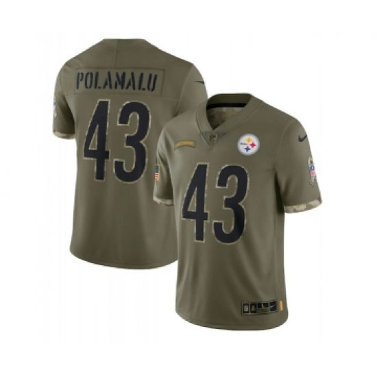 >Men's Pittsburgh Steelers #43 Troy Polamalu 2022 Olive Salute To Service Limited Stitched Jersey