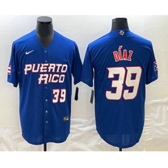 >Mens Puerto Rico Baseball #39 Edwin Diaz Number 2023 Blue World Baseball Classic Stitched Jersey