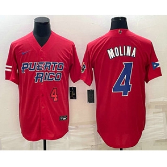>Men's Puerto Rico Baseball #4 Yadier Molina Number 2023 Red World Baseball Classic Stitched Jerseys