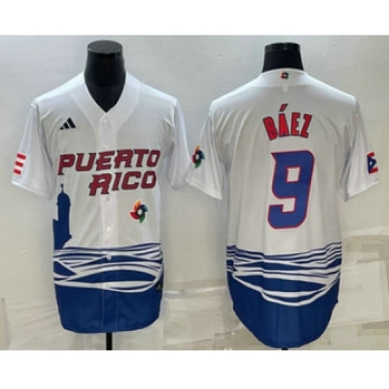 Men's Puerto Rico Baseball #9 Javier Baez White 2023 World Baseball Classic Stitched Jerseys