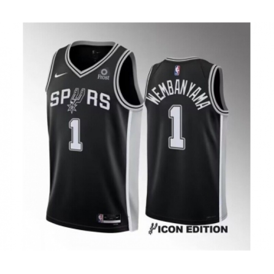 >Men's San Antonio Spurs #1 Victor Wembanyama Black 2022-23 Icon Edition Stitched Basketball Jersey