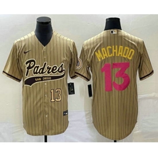 Men's San Diego Padres #13 Manny Machado Number Tan Pinstripe 2023 City Connect Cool Base Stitched Jersey