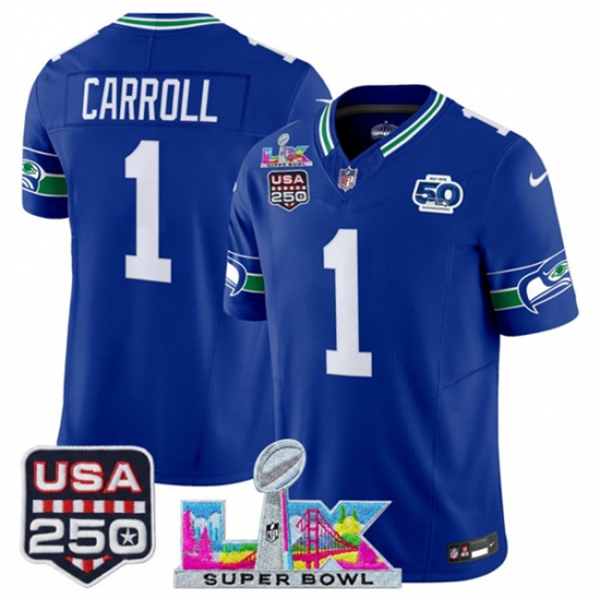 >Men's Seattle Seahawks #1 Pete Carroll Royal 2025 F.U.S.E. Super Bowl LX And 50th Season & USA 250 Vapor Throwback Limited Football Stitched Jersey
