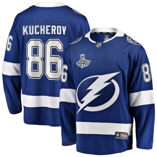 >Men's Tampa Bay Lightning #86 Nikita Kucherov Fanatics Branded Blue Home 2020 Stanley Cup Champions Breakaway Jersey