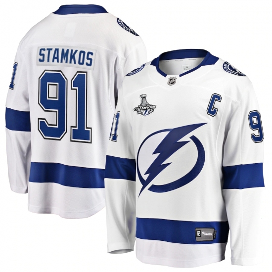 >Men's Tampa Bay Lightning #91 Steven Stamkos Fanatics Branded White Away 2020 Stanley Cup Champions Breakaway Jersey