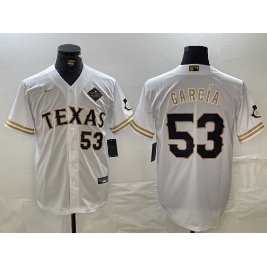 Men's Texas Rangers #53 Adolis Garcia Number White Gold Cool Base Stitched Baseball Jersey