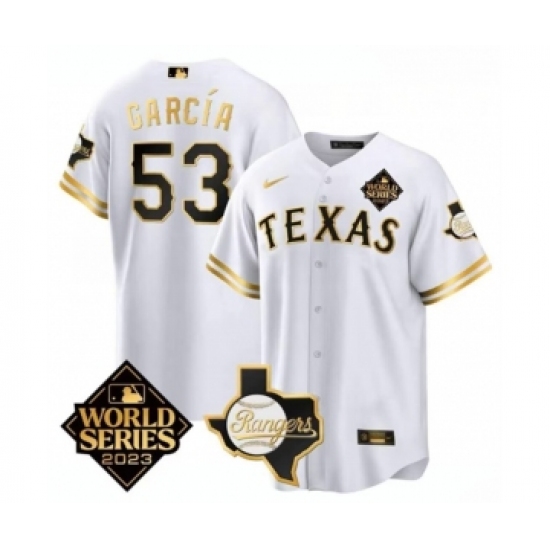 Men's Texas Rangers & Cowboys #53 Adolis García White 2023 World Series Splite Stitched Baseball Jersey
