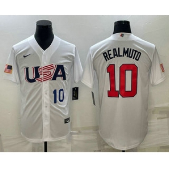 >Mens USA Baseball #10 JT Realmuto Number 2023 White World Baseball Classic Stitched Jersey