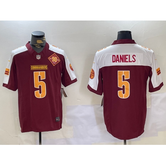 >Men's Washington Commanders #5 Jayden Daniels Red Thanksgiving 2024 FUSE With 90th Vapor Limited Stitched Jersey