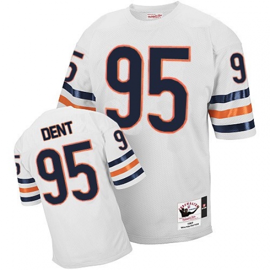 Feel like part of your favorite team by wearing this NFL® Mitchell And Ness Chicago Bears #95 Richard Dent Authentic Jersey White Authentic Throwback NFL Jersey, made of thick, high-quality Pro-Brite fabric for a genuine gridiron look. The players number which 100% stitched is displayed in tackle twill on the chest, back and sleeves, along with the team name on the front. The players name which 100% stitched is displayed on a sewn-down nameplate at the back. 100% Pro-Brite nylon and 100% Pro-Brite polyester for body, 100% lycratalic spandex dazzle for Side Panels/Collar/Cuffs, NFL® Equipment patch sewn on the bottom of the front collar or fabric insert, NFL® Equipment jock tag with numeric sizing is applied to the lower left bottom of the jersey, Officially licensed