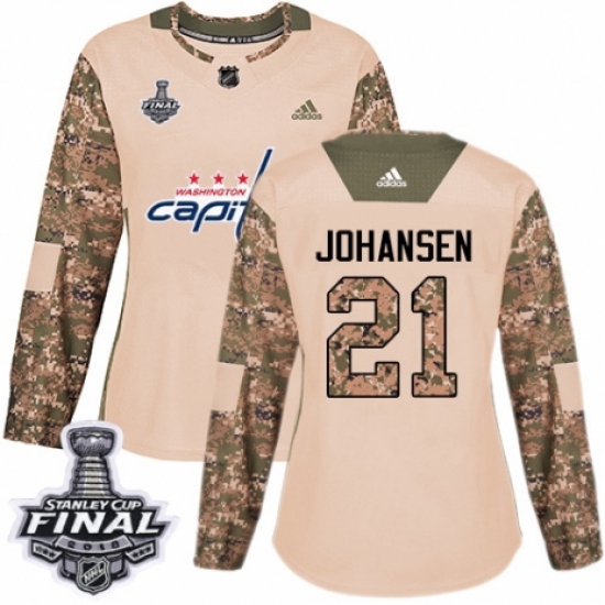 >Women's Adidas Washington Capitals #21 Lucas Johansen Authentic Camo Veterans Day Practice 2018 Stanley Cup Final NHL Jersey