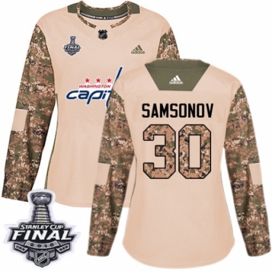 Women's Adidas Washington Capitals #30 Ilya Samsonov Authentic Camo Veterans Day Practice 2018 Stanley Cup Final NHL Jersey