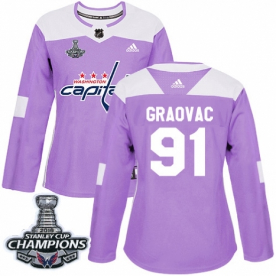 >Women's Adidas Washington Capitals #91 Tyler Graovac Authentic Purple Fights Cancer Practice 2018 Stanley Cup Final Champions NHL Jersey