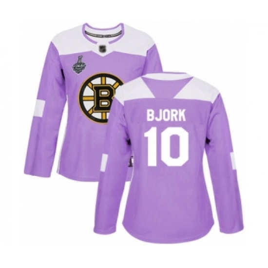 >Women's Boston Bruins #10 Anders Bjork Authentic Purple Fights Cancer Practice 2019 Stanley Cup Final Bound Hockey Jersey
