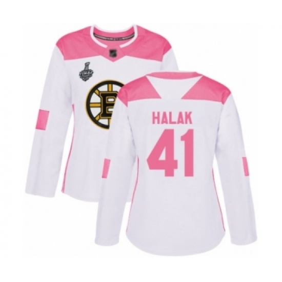 Women's Boston Bruins #41 Jaroslav Halak Authentic White Pink Fashion 2019 Stanley Cup Final Bound Hockey Jersey