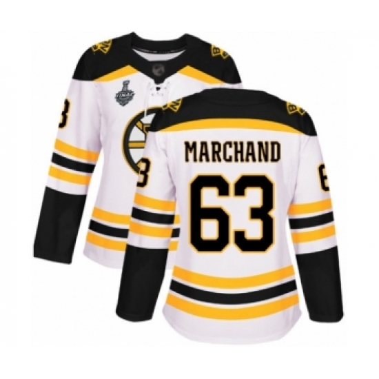 Women's Boston Bruins #63 Brad Marchand Authentic White Away 2019 Stanley Cup Final Bound Hockey Jersey