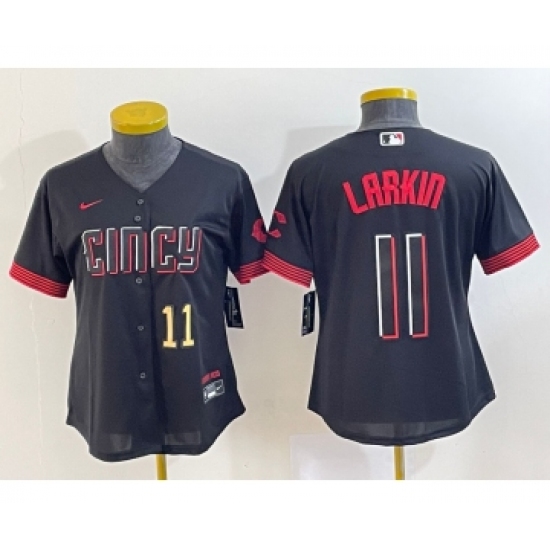 >Women's Cincinnati Reds #11 Barry Larkin Number Black 2023 City Connect Cool Base Stitched Jersey
