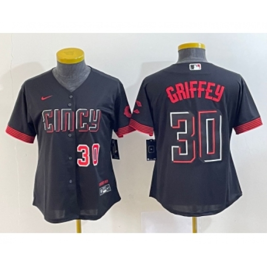 >Women's Cincinnati Reds #30 Ken Griffey Jr Number Black 2023 City Connect Cool Base Stitched Jersey